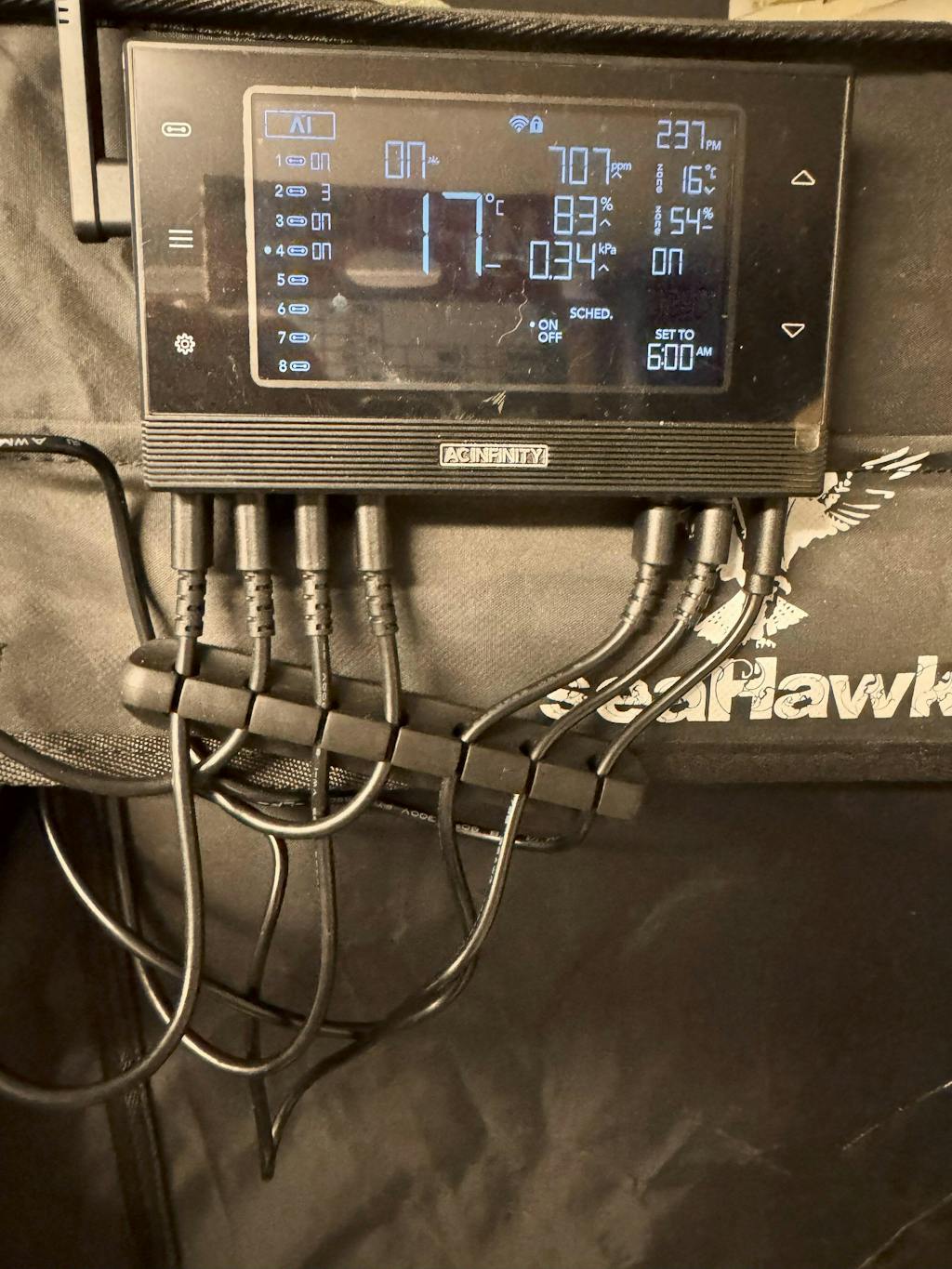 The photos depict the controller and telemetry for the current state. Port 1: is the humidifier - Port 2: ACI Inline fan - Port 3: C02 and light meter Port 4: Light Cycle. The rest is self explanatory.